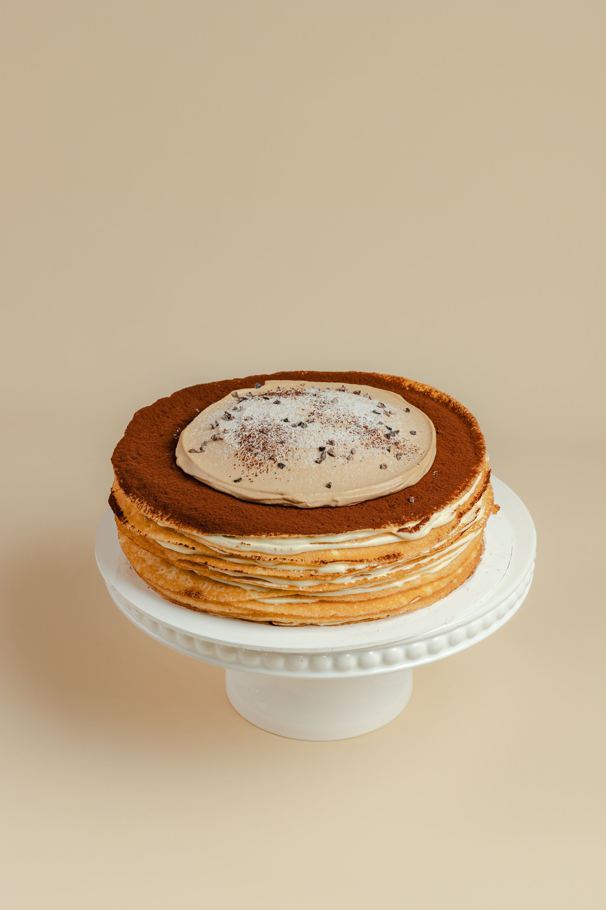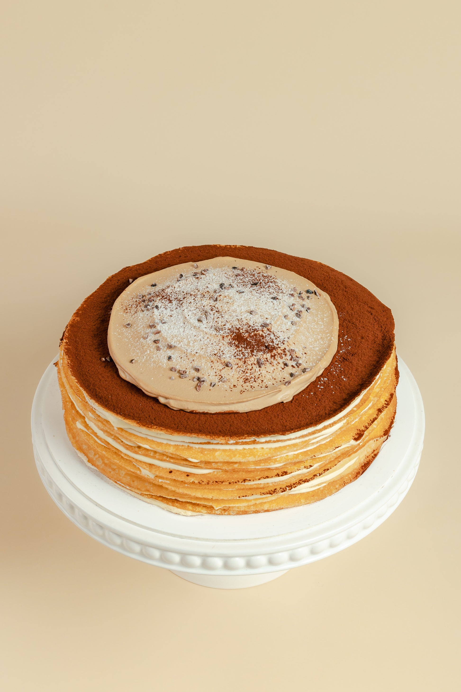 A delightful twist on the classic Italian dessert, our Tiramisu Mille Crepe Cake features layers of delicate crepes infused with espresso and filled with a light mascarpone cream. Each bite offers the perfect harmony of rich coffee flavor, velvety smoothness, and a touch of cocoa for a refined finish. Soft, airy, and irresistibly indulgent, this cake is a must-try for tiramisu lovers.Large (8”-serves 8-12 people)